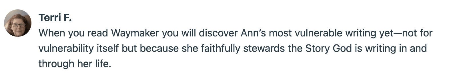 Ann’s special skill is not in the telling of her own story to point us to her wonderful self, but in the channeling of her story to point us to the wondrous Christ who not only shows us the way, but who is The Way.